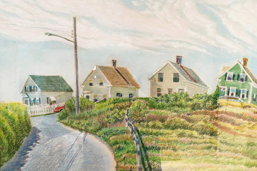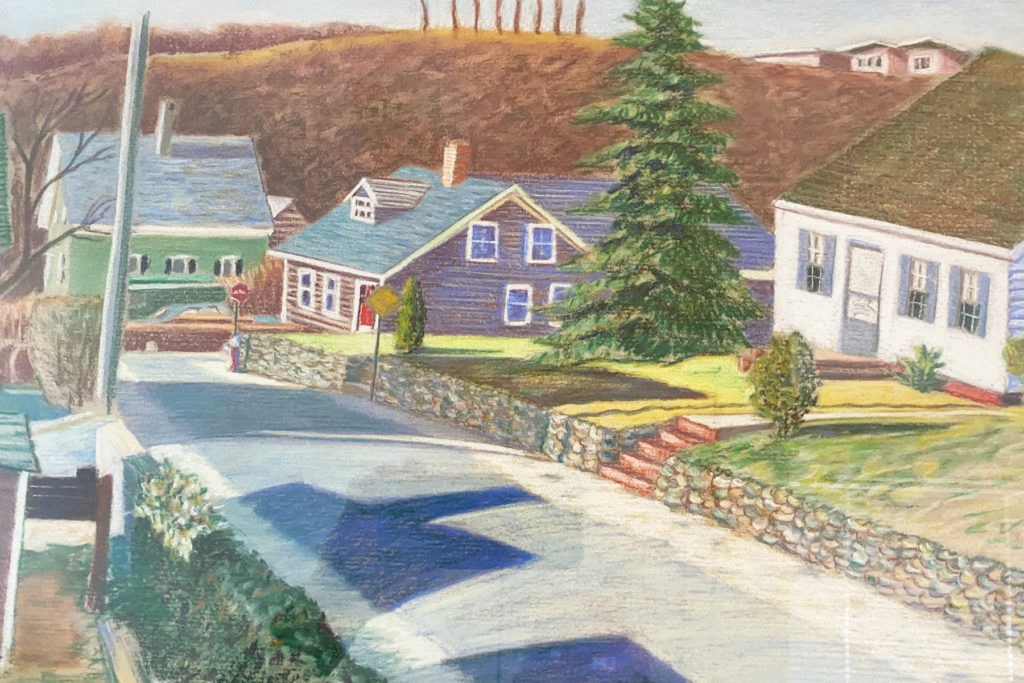 This is another pastel that we have by Bradley Dehner from 1983. It is a view from the Franklin Street – Race Road intersection up the hill toward Bradford Street in the West End. What a wonderful repesentation of the traditonal Cape style of houses so prevalent here. From left to right is 42, 44, 46 and 48 Franklin Street.